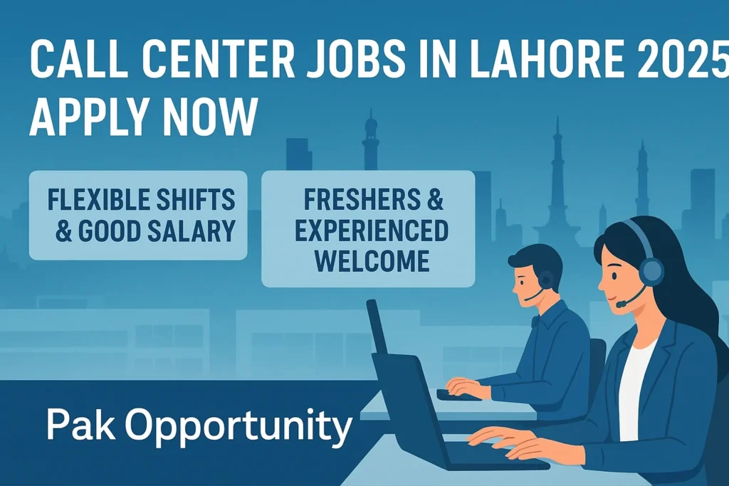 Freshers and experienced candidates can apply for Lahore call center jobs. Browse openings now on Pak Opportunity. See the latest Call Center Jobs in Lahore 2025. Great salary, flexible shifts, and career growth. Here, you can see all details on government and Private Jobs in Pakistan, and also the Chance to going Other country.